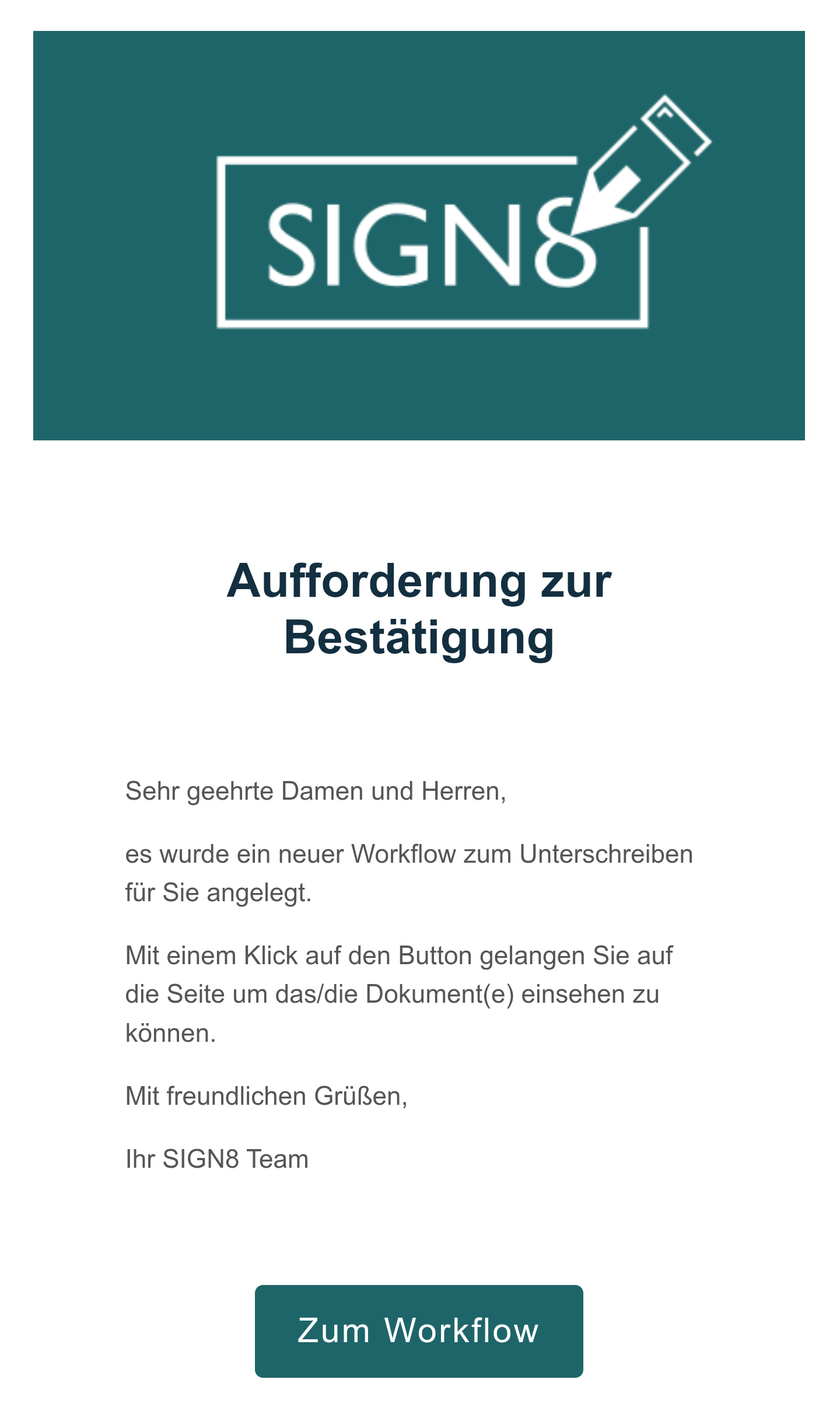 Schritt 1: Öffnen Sie zunächst die E-Mail „Einladung zu einem Workflow – SIGN8“ auf Ihrem PC und klicken Sie auf „Zum Workflow“.