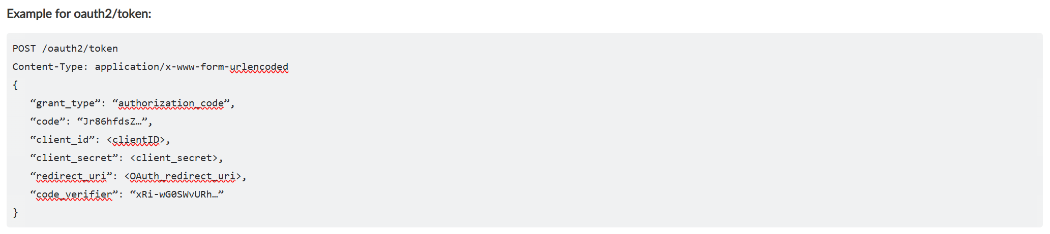 POST /oauth2/token Content-Type: application/x-www-form-urlencoded { “grant_type”: “authorization_code”, “code”: “Jr86hfdsZ…”, “client_id”: <clientID>, “client_secret”: <client_secret>, “redirect_uri”: <OAuth_redirect_uri>, “code_verifier”: “xRi-wG0SWvURh…” }