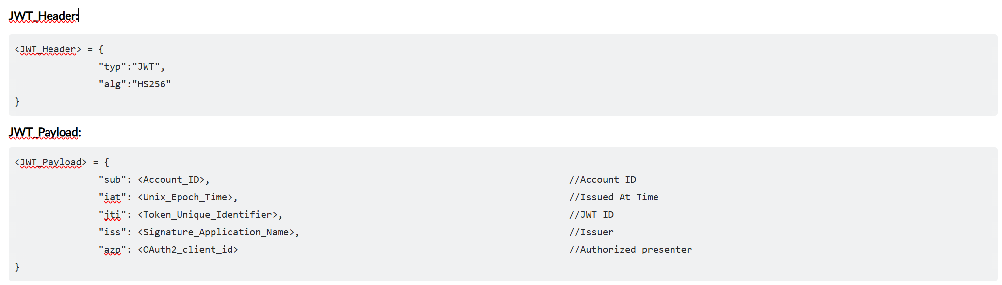 account_token = base64UrlEncode(<JWT_Header>) + "." + \ base64UrlEncode(<JWT_Payload>) + "." + \ base64UrlEncode(<JWT_Signature>)