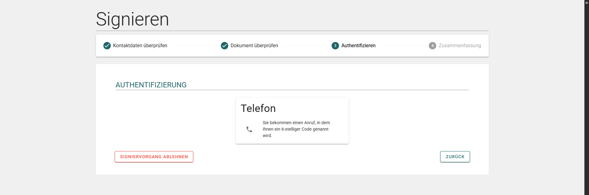 Wenn in Ihrem Account statt einer Mobilfunknummer eine Festnetznummer hinterlegt ist, wird Ihnen bei einem weiteren Siegelvorgang ausschließlich die Option "Telefon" angezeigt. Die Authentifizierungsmethode SMS steht in diesem Fall nicht zur Verfügung. Um einen Anruf zur Authentifizierung zu erhalten, klicken Sie bitte auf den Button "Telefon". Der Anruf wird nicht automatisch gestartet.